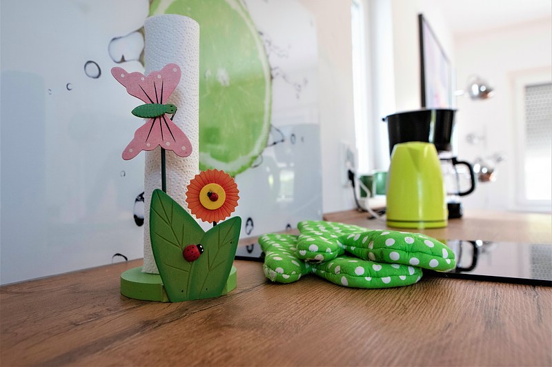 - Einbauküche, Teller, Tassen, Besteck, Mini- Backofen, Filterkaffeemaschine, Cerankochfeld, Toaster, Wasserkocher,Spülmaschine, Geschirrhandtuch, Weingläser
