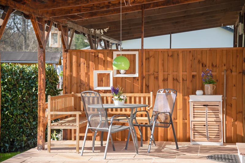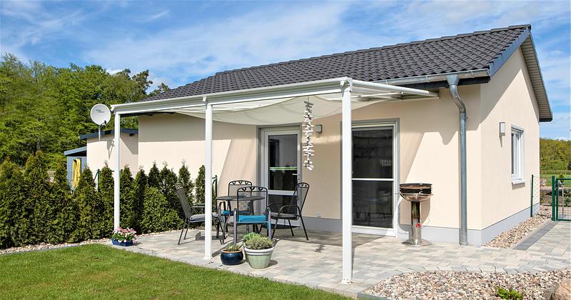 Die überdachte Sonnenterrasse ist nach Südwesten ausgerichtet und mit Gartenmöbeln ausgestattet. Das Grundstück ist mit einem Zaun umfriedet und somit auch für Kinder bestens geeignet. Die Zaunhöhe von 1m gestattet den Hunden freien Auslauf auf dem 200 m² großen Grundstück. Direkt am Ferienhaus kannst Du Dein Auto abstellen.